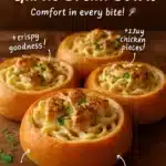 Chicken Alfredo Garlic Bread Bowls mix creamy sauce, tender chicken, and pasta in a crunchy bread bowl. You get pasta and bread in one dish. If you like similar simple meals, try cheesy chicken garlic wraps for another easy option.